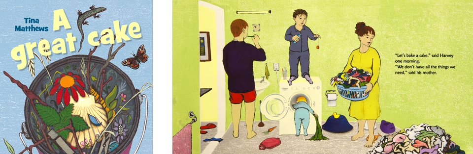 I loved writing and illustrating A Great Cake. It’s quite unlike my other books and has only 64 different words, most of those from a recipe which is repeated four times. That doesn’t sound like much of a story but, with the help of the pictures, a lot happens in the 32 pages and by the end of the book the reader knows Harvey and his family pretty well. It’s a book about the pleasure of imaginative play. And, as the title suggests, it’s also a book about cake. More particularly, about how to make a cake and eat it with friends.